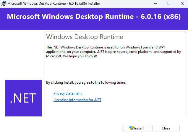 a) Windows Desktop Runtime must first be updated or installed by following the installation process: