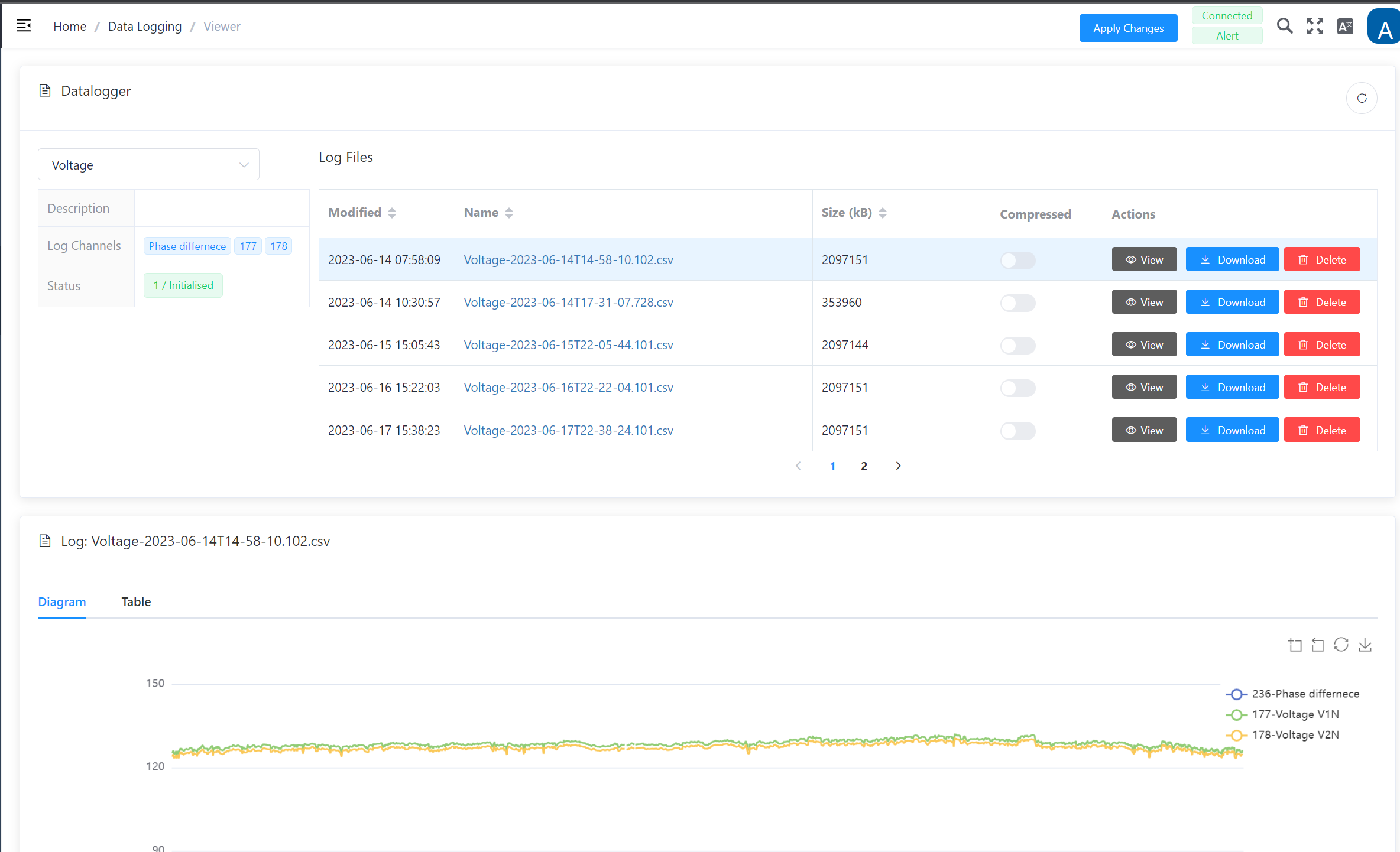 The Viewer provides access to the saved data for the individual jobs. Use the drop-down menu on the top left to select the relevant job and, in addition to the general information (description, channels and status), all log files that have already been created are displayed chronologically.