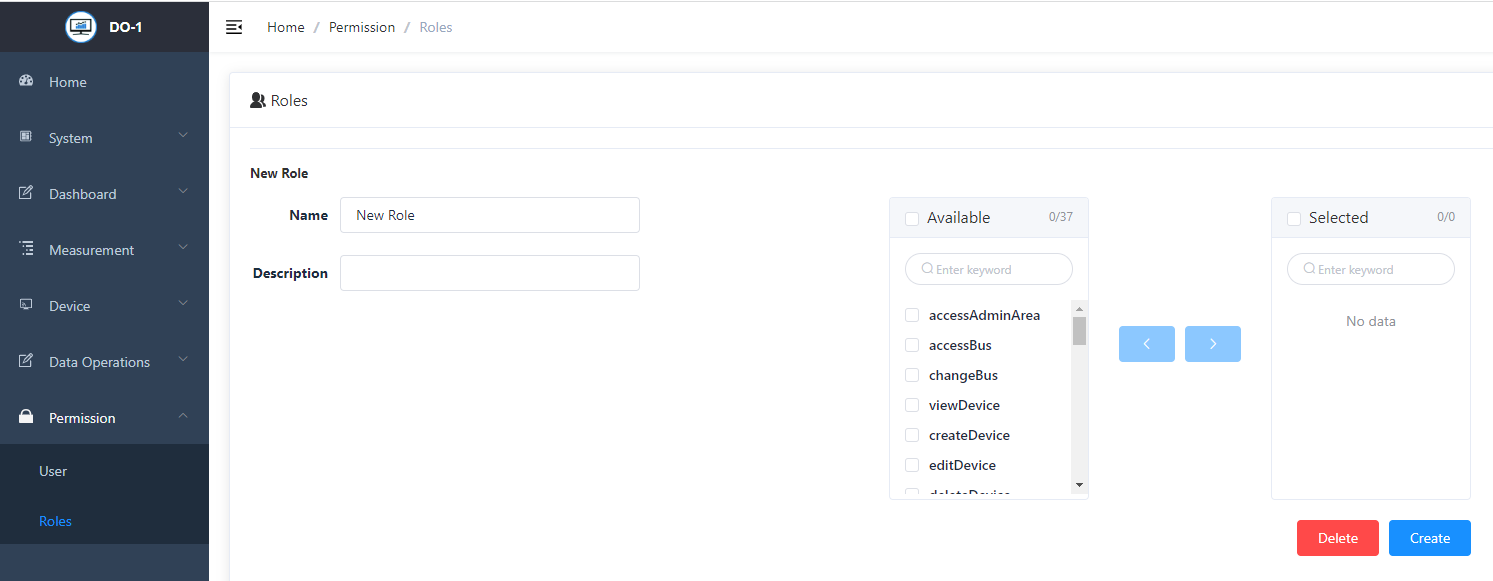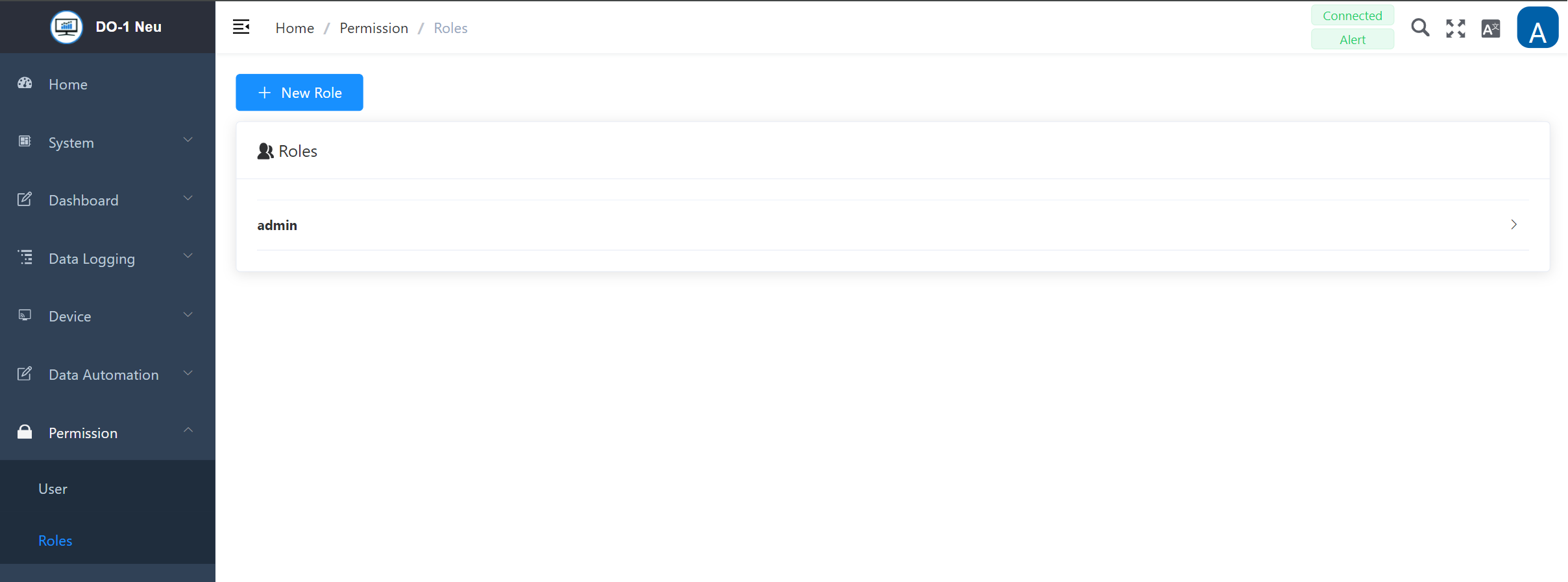 Clicking on the menu item Roles takes you to the overview page of the roles in the system. The Admin role is preset by default. The administrator is responsible for the settings and changes to the DO-1 and can assign specific roles with individual permissions here. The admin role cannot be changed.