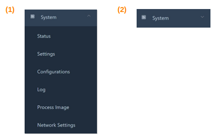 All these menu items contain submenus which can be expanded (1) or collapsed (2) by clicking on the respective menu item.