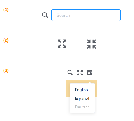 On the page header you may: (1) Search for content in the web portal, (2) Enable or disable full screen mode,(3) Change the desired language (currently English, German, Spanish can be selected).