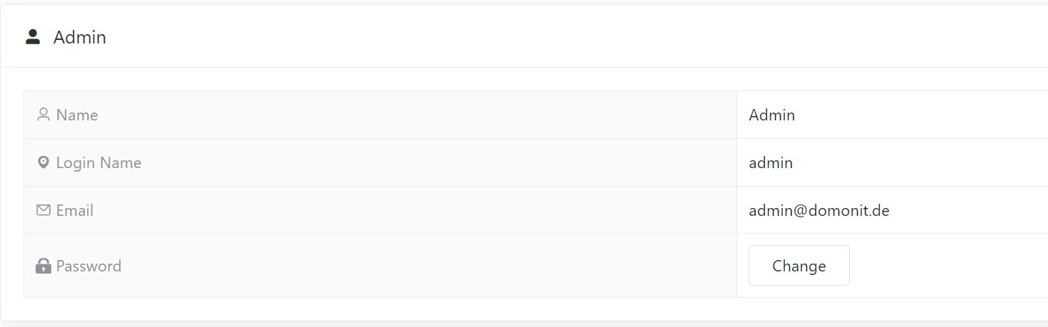 Direct link to your own user profile. By clicking the “Profile” option, you will be redirected to your own profile page. Here you will find the basic information and can also change the password for your own user. It is recommended to change the default password “admin” after the first login to ensure the security of your account.