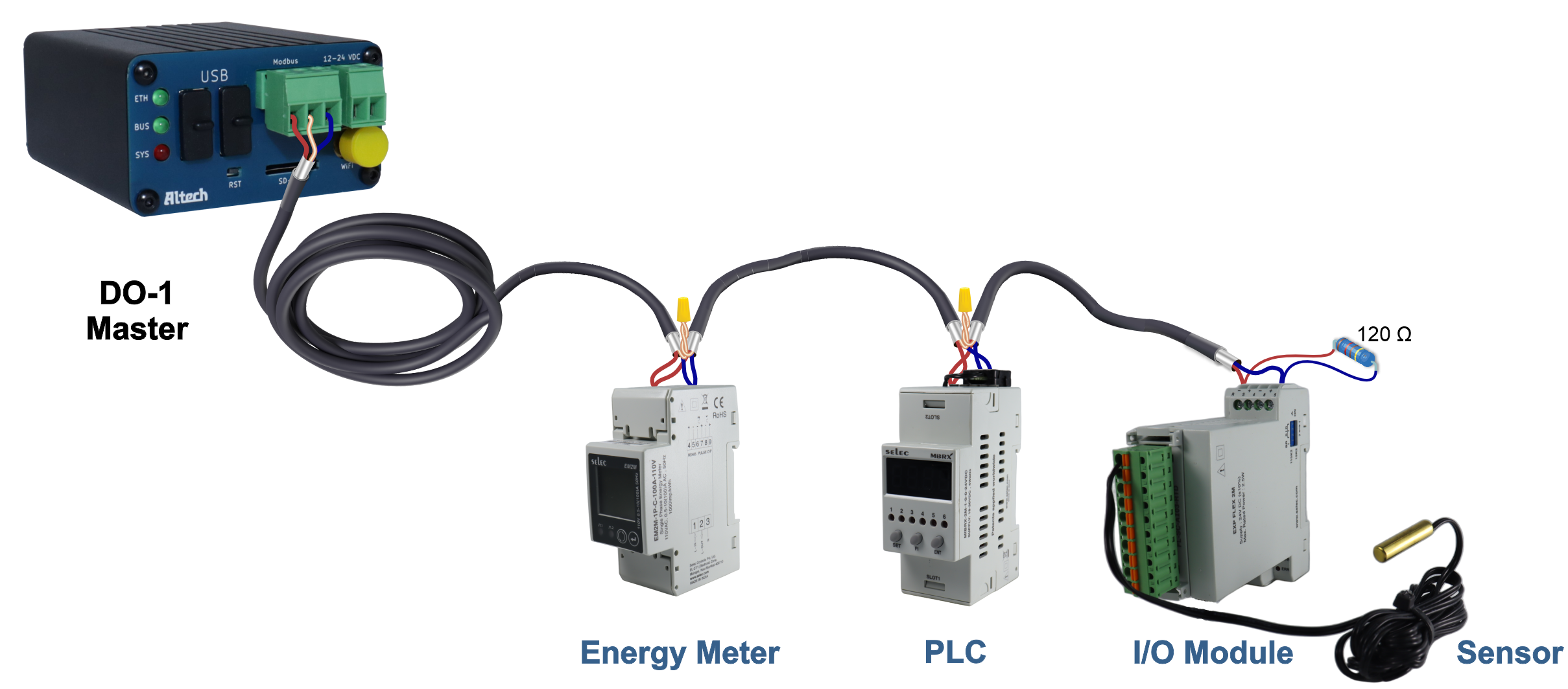 ℹ️The terminating resistor is normally only connected to the ends of the RS485 line and not to each device. If you have multiple devices in an RS485 communication chain, you should only use the terminating resistor at the ends of the line, not at each device in between.⚠️DO-1 only requires one terminating resistor at the end of the line as it already has an integrated 120 Ohm terminating resistor. -
